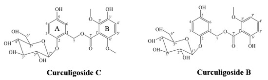 - Wang, Z.H.; Huang, J.; Ma, X.C.; Li, G.Y.; Ma, Y.P.; Li, N.; Wang, J.H. Phenolic glycosides from Curculigo orchioides Gaertn. J. Fitoter. 2013, 86, 64–69. [Google Scholar] [CrossRef] [PubMed]
