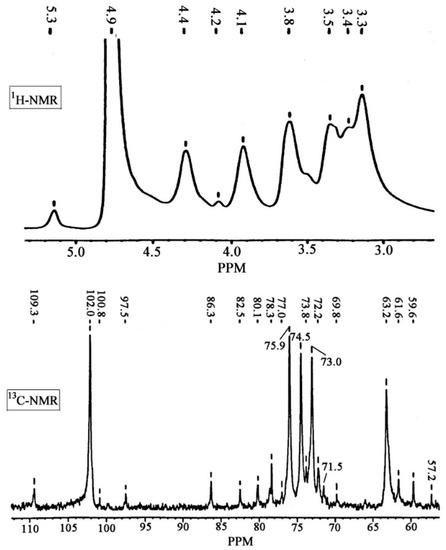 The FT-IR spectra of the hemicellulosic fractions were recorded on a Bruker spectrophotometer (Bruker BioSpin AG, Fällanden, Switzerland) in the range of 4000 to 400 cm−1 with a resolution of 4 cm−1. A KBr disc containing 1% finely ground hemicelluloses was used for measurement. The solution–state 1H and 13C NMR spectra were recorded on a Bruker AV III 400 MHz spectrometer operating in the FT mode at 100.6 MHz. The purified hemicelluloses (15 mg for 1H NMR and 80 mg for 13C NMR) were dissolved in 1 mL of D2O, and then the resonance spectra were obtained. For 1H NMR spectra, the acquisition and relaxation times were 3.9 and 1.0 s, respectively. For 13C NMR spectra, the spectra were recorded at 25 °C after 30,000 scans. A 30° pulse flipping angle, 9.2 μs pulse width, 1.36 s acquisition time, and 1.89 s relaxation delay time were used. The spectral widths were 2200 and 15,400 Hz for the 1H and 13C dimensions, respectively.