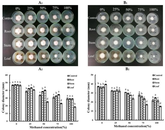 Figure 2. (A1): Effects of different concentrations of methanol crude extracts from A. annua against F. oxysporum, and the mycelium growth for 5 days. (B1): Effects of different concentrations of methanol extracts from A. annua on F. solani. (A2): The colony diameter (mm) of F. oxysporum by treated with different crude extracts. (B2): The colony diameter (mm) of F. solani by treated with different crude extracts. Note: Different letters represent significant differences (p < 0.05) among different plant parts at the same methanol concentration, while with the same letters mean no significant difference (p > 0.05).