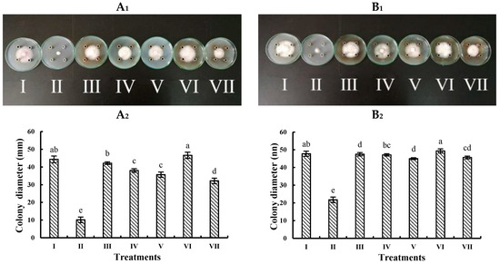 Figure 3. Inhibitory effect of fractions II−VII from A. annua on F. oxysporum and F. solani. A1: The mycelium growth of F. oxysporum for 5 days. B1: The mycelium growth of F. solani for five days. A2: The colony diameter (mm) of F. oxysporum under different components. B2: The colony diameter (mm) of F. solani under different components. I: Negative control; II: EO; III: Water soluble extract; IV: Methanol soluble extract; V: Chloroform soluble extract; VI: Water soluble extract; VII: Methanol soluble extract directly extracted by ultrosonic method. Note: In the same figure, different letters represent significant differences (p < 0.05) among different treatments, while with the same letters mean no significant difference (p > 0.05).