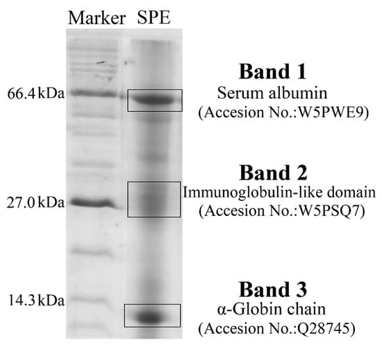 SDS-PAGE and mass spectrometry were performed to determine the main proteins and their molecular weight distribution. There were three main electrophoresis bands in the SDS-PAGE profiles of SPE, with molecular weight around 66.4 kDa, 27.0 kDa and 14.3 kDa (Figure 1). Mass spectrometry analysis of these three prominent bands showed the main proteins around 66.4 kDa were serum albumins, while the proteins around 27.0 kDa were immunoglobulin-like domains. The proteins around 14.3 kDa mainly belonged to the globulin family. The albumins and the immunoglobulin-like domains play important roles in the immune system and inflammation regulation [10]. Apart from the proteins, peptides and other bioactive compounds may also contribute to the bioactivity of placenta extract. Some previous studies have indicated peptides from goat placenta extract and human placenta extract had numerous bioactivities, such as antioxidant and anti-inflammatory activities [11,12,13]. Moreover, some cytokines and growth factors in placenta extract were also found to be essential for tissue regeneration [14,15].