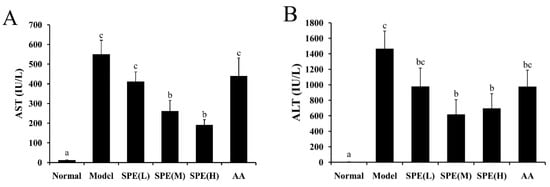 The effects of sheep placental extract (SPE) on serum biochemical markers 8 h after injection of Con A. The activities of alanine transaminase (AST) and aspartate transaminase (ALT) are presented in (A,B), respectively. Values are represented as means ± SE (n = 11). a, b, c and bc in the figures show statistically significant differences (p < 0.05) among groups. The experimental groups pretreated with low dose SPE (5 mg/kg), medium dose SPE (10 mg/kg), high dose SPE (50 mg/kg) or the mixture of 18 amino acids equal to 50 mg/kg SPE group are labelled as SPE (L), SPE (M), SPE (H) and AA, respectively.