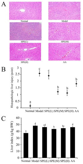 Histological analysis could be used to reveal the extent of hepatocyte swelling, degeneration and inflammatory infiltration in liver. The degree of liver edema was indicated by the liver index. Figure 3 shows representative images of liver H&E staining, histological analyses and liver index in the different groups. When mice were administered with 15 mg/kg Con A for 8 h, the model group suffered extensive liver damages (around grade 2.5) and pronounced lesions were observed in the livers. Pretreatment with the medium dose (10 mg/kg) or the high dose (50 mg/kg) of SPE for 3 d before Con A injection significantly alleviated the injury shown by liver histopathology and efficiently decreased the accompanying liver index (p < 0.05). Administration of amino acids equivalent to 50 mg/kg SPE had no significant effect on the liver index (p > 0.05). Histological examination of liver tissues further confirmed the serum biochemical findings, indicating that SPE had significant hepatoprotective effects in the Con A-induced immunological liver injury model.