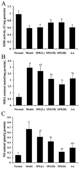 NO, a hepatotoxic small molecule produced in Con A-induced models, causes cascade amplification of liver damage [16]. The hepatic NO levels in different treatment groups are shown in Figure 4C. Compared with normal mice, the NO content in the Con A-induced model group increased 400%. The medium dose (10 mg/kg) and high dose (50 mg/kg) SPE pretreatments significantly decreased the content of NO in liver tissues (p < 0.05).