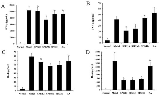 The effects of sheep placental extract (SPE) on the concentration of IFN-γ (A), TNF-α (B), IL-4 (C) and IL-6 (D) in serum. Values are represented as means ± SE (n = 11). a, b, c and bc in the figures indicate statistically significant differences (p < 0.05) among groups. The experimental groups pretreated with low dose SPE (5 mg/kg), medium dose SPE (10 mg/kg), high dose SPE (50 mg/kg) or the mixture of 18 amino acids equal to the 50 mg/kg SPE group are labelled as SPE (L), SPE (M), SPE (H) and AA, respectively.