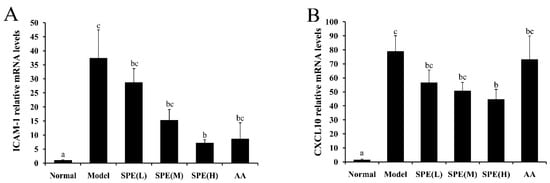 The secretion of adhesion molecules is a hallmark in the pro-inflammatory state of leukocytes, and chemokines direct the migration of circulating leukocytes to sites of inflammation or injury [32]. Compared with the Con A-induced model group, pretreatment with SPE showed lower mRNA expression of ICAM-1 and CXCL10 in a concentration-dependent manner, and significant decrease was observed in the high dose SPE treatment group (Figure 6A,B) (p < 0.05), which indicated the beneficial effects of SPE may be related to the regulation of T cell distribution [33].