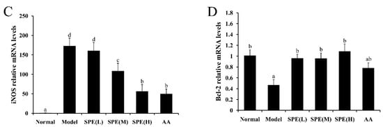 The expression of Bcl-2, an essential anti-apoptotic protein, plays a key role in the regulation of cell proliferation and apoptosis, as well as inflammatory injury [35]. The injection of Con A could lead to the increase of hepatocyte apoptosis, which is a crucial mechanism leading to hepatic dysfunction [36]. The mRNA expression level of Bcl-2 was measured to investigate the effect of SPE treatment on the liver cells apoptosis. It showed that pretreated with SPE, rather than the mixture of amino acids, significantly promoted the mRNA expression of Bcl-2 (Figure 6D), which further suggested the protective effect of SPE on Con A-induced liver cell apoptosis.