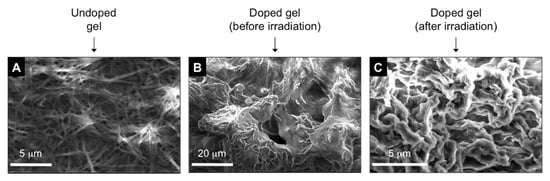 Finally, comparative field-emission scanning electron microscopy (FE-SEM) indicated that the inclusion of reactants in the gel caused an apparent densification of the network, which conserved a fibrillar aspect (Figure 3A,B). The images of the reactive gel (i.e., gel doped with reactants) before and after irradiation showed similar morphological features (Figure 3B,C). In agreement with our previous observations [17], this suggests that the sensitized chemical reaction occurs most likely in the solvent pools held between the fibers. The compartmentalized nature of the gel medium, which increases the surface-to-volume ratio compared to solution, together with a potential increment of local substrate concentration, and reduction of the diffusion of external oxygen through the viscous gel/air interface, seem to play a crucial role for the occurrence of the photoinduced process under aerobic conditions, with similar reaction kinetics [13], and higher product selectivity compared to homogeneous solution.