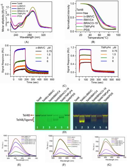 Further gel assays and fluorescence spectra were conducted to examine whether the late addition of o-BMVC could replace those G4 ligands, which formerly bound to Tel48. For comparison, gel assays showed four pairs of Tel48/ligands, BMVC4, BRACO-19, TMPyP4 and PDS, without and with the late addition of o-BMVC for 2 h (Figure S3). We found the further decrease of free Tel48 in the presence of BMVC4, BRACO-19 and TMPyP4 together with nearly no appreciable o-BMVC fluorescence detected in the presence of BMVC4 and weak o-BMVC fluorescence detected in the presence of TMPyP4 and BRACO-19 after the late addition of o-BMVC. However, we did observe bright o-BMVC in the presence of PDS after the late addition of o-BMVC, suggesting that PDS did not inhabit the binding mode of o-BMVC to Tel48. Fluorescence spectra allowed us to quantitatively measure the fluorescence intensity of the late addition of o-BMVC for Tel48/ligand complexes and showed no appreciable difference for PDS, ~45% for BRACO-19,~20% for BMVC4, and ~5% for TMPyP4 to the fluorescence intensity of Tel48/o-BMVC (Figure 2F). In addition, fluorescence spectra were detected for the late addition of BRACO-19, BMVC4, and TMPyP4 to the Tel48/o-BMVC complexes (Figure 2G). It is not clear why there is no appreciable o-BMVC fluorescence in the presence of BMVC4 in gel assays. Of interest was the slight increase of intensity of o-BMVC fluorescence after the late addition of PDS, which might be due to PDS-induced G4 formation. Nevertheless, similar results of these two sets of fluorescence spectra suggested that the detection of different intensities of o-BMVC fluorescence was due to the equilibrium established among free Tel48, Tel48/o-BMVC and Tel48/ligand, implying that o-BMVC and these G4 ligands compete with the same binding site. This finding is important because these G4 ligands of TMPyP4, BMVC4 and BRACO-19 indeed bind to G4 structures in cells, which provides a means of screening G4 binding ligands.
