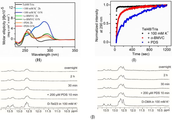 Additionally, the CD spectra showed that o-BMVC and PDS can induce single-stranded Tel48 to form G4s in Tris buffer solution without the presence of K+ (Figure 2H). However, the CD intensity was much stronger upon addition of 100 mM K+. The real time CD signal at 290 nm of Tel48 monitored G4 formation induced by the addition of o-BMVC, PDS and 100 mM K+ into Tris buffer solution (Figure 2I). The results suggested that the K+ -induced G4 formation was faster than the o-BMVC-induced G4 formation and much faster than the PDS-induced G4 formation. Similar results were obtained for TMPyP4 and BRACO-19 that can induce G4 formation in Tris buffer solution (Figure S4).
