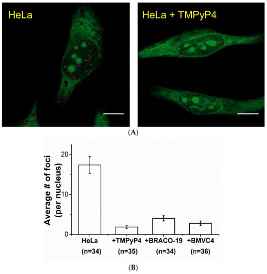 In another study, we used a G4 fluorescent probe, 3,6-bis(1-methyl-2-vinylpyridinium) carbazole diiodide (o-BMVC), to visualize G4s in cancer cells [9]. We took advantage of the fluorescent decay time of o-BMVC, which is longer upon binding to most G4s formed by G-rich sequences in telomeres and some promoter oncogenes (≥2.4 ns) than upon interaction with duplex structures such as linear duplexes and hairpin structures (~1.2 ns) [9,10]. In addition, the binding affinity of o-BMVC to G4 DNA is higher than to duplex DNA by nearly two orders of magnitude [9]. Very recently, we also detected elevated o-BMVC foci in HeLa cancer cells after PDS pretreatment by time-gated fluorescence lifetime imaging microscopy (FLIM) [10]. Of importance is that many more o-BMVC foci are detected in six types of cancer cells than in three types of normal cells, implying that G4s are likely a common signature of cancer cells.