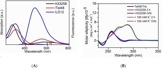 Previously, Maiti et al. [25] reported that H33258 can bind to the G4 structure of human c-MYC. However, Largy et al. [33] found that H33258 clearly shows a structural preference for duplex DNA and has a lower capacity to bind G4s. Figure 4A showed the absorption and fluorescence spectra of free H33258 and its complexes with G4 DNA of Tel48 and duplex DNA of LD12 in 100 mM K+ solution. The fluorescence intensity of H33258 was much stronger upon interaction with LD12 duplex than with Tel48 G4s. The CD spectra showed no Tel48 G4 formation induced by H33258 in Tris buffer solution (Figure 4B). The melting temperature of Tel48 G4s showed a slight increase of ~4 °C upon interaction with H33258 (Figure 4C). However, we were not able to measure the reliable binding constants of H33258 to Tel48 because of insufficient signals in the study of interferometry. The gel assays of H33258 showed no specific effect on Tel48 G4, but clear fluorescence upon interaction with LD12 duplex (Figure 4D). In addition, the fluorescence clearly observed for the late addition of o-BMVC into the Tel48/H33258 mixture suggested no appreciable effect of H33258 on the binding of o-BMVC to Tel48 G4s.