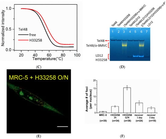 We anticipated that the pretreatment of cells with H33258 would have less effect on the subsequent binding of o-BMVC to G4s. Figure 4E showed time-gated FLIM images of o-BMVC foci in the pretreated MRC-5 normal cells with 10 µM H33258 overnight. Quantitative analyses of the number of o-BMVC foci in the nucleus showed a slight increase in the pretreated MRC-5 normal cells with 10 µM H33258 for 2 h, but a marked increase in the pretreated cells with 10 µM H33258 overnight (Figure 4F). Previously, pretreatment with DNA damage by exposing MRC-5 normal cells to UV light could markedly increase the number of o-BMVC foci [10]. It is possible that the binding of H33258 to duplex DNA in cells may also lead to genomic instability, opening the chromatin and facilitating G4 formation from unprotected G-rich sequences. In addition, we found a gradual decrease of the induced o-BMVC foci after terminating UV-irradiation. The decrease of o-BMVC foci induced by DNA damage is probably due to the function of DNA repair [34]. Here, we also found that the number of o-BMVC foci induced by H33258 gradually decreases as a function of time after H33258 was removed (Figure 4F). We consider that the decrease of o-BMVC foci is mainly due to DNA repair [10].