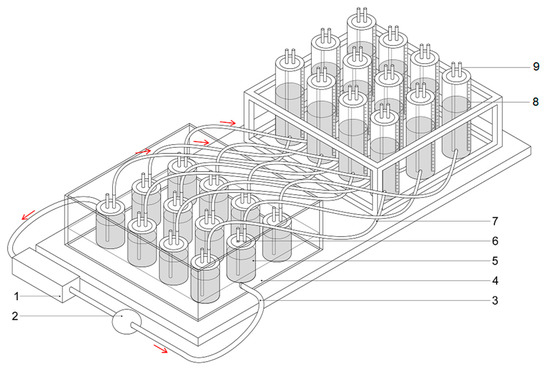 Figure 1. Biofermenter for biogas production tests (18-chamber section): 1—water heater with temperature adjustment; 2—water pump; 3—insulated tubes for liquid heating medium; 4—water jacket (39 °C); 5—biofermenter (1.4 dm3); 6—slurry-sample drawing tube; 7—tube for transporting the biogas; 8—graduated tank for biogas; 9—gas sampling valve.
