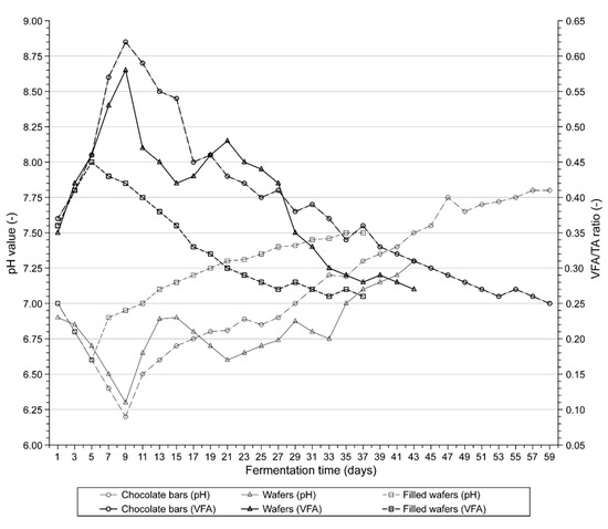 The situation was much less favourable for the other two substrates—CB and W, because the process of anaerobic digestion was much less stable. The curves shown in Figure 2 indicate a rapid decrease in the pH to 6.20 (W) and 6.28 (CB) on day 9. It was caused by the accumulation of VFA, as the VFA/TA ratio increased to 0.57 (W) and 0.63 (CB). However, it is noteworthy that the accumulation of VFA and reduction of pH during the initial phases of anaerobic digestion is common, especially in batch systems, due to methanogens’ lag and slow response to the consumption of the substrates provided to them by acidogens [24]. Further analysis of the diagram in Figure 2 shows that between days 15 and 21, the pH of the wafer digestion mixture decreased again but at a muchslower rate. During the consecutive days of the AD process the pH of both substrates gradually increased, whereas the VFA/TA ratio decreased. The biodegradation of W was slower than that of FW, as it lasted 43 days. However, the longest retention time, i.e., 59 days, was noted for CB.
