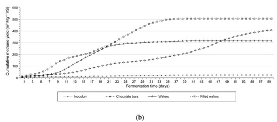 The reason why so different yields of methane were obtained for the confectionery waste tested was also their chemical compositions were different (Table 1). Their different levels of the various components—having different biodegradabilities—could have resulted in their methane yields being lower than the theoretical BMP. The probability that relationship has occurred can be related to the fiber, showing a statistically significant relationship with yields for chocolate bars, sucrose, and positively correlating with the biogas volume generated from wafers.