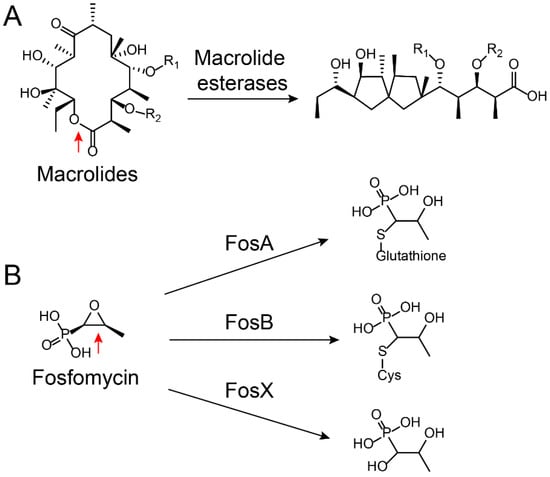 Ring-opening reactions catalyzed by (A) macrolide esterases [73] and (B) fosfomycin-resistance enzymes FosX/A/B [77]. The hydrolysis sites on the antibiotics are marked by red arrows.