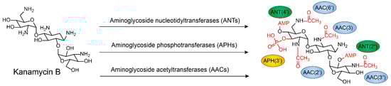 Modification of kanamycin B by aminoglycoside nucleotidyltransferases (ANTs), phosphotransferases (APHs), and acetyltransferases (AACs) [87,88,89,90,91].