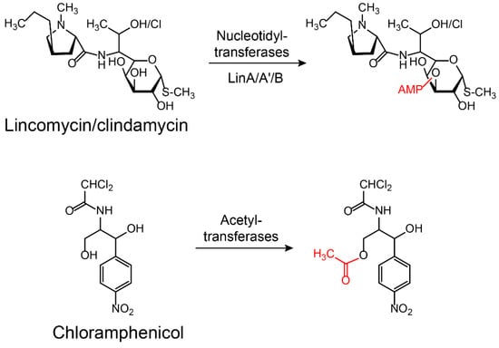 Inactivation of lincomycin/clindamycin and chloramphenicol by nucleotidyltransferases or acetyltransferases. LinA/A’/B: Lincomycin nucleotidyltransferases A/A’/B.
