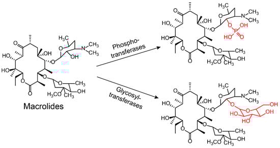 Enzyme-catalyzed inactivation of macrolides by phosphotransferases and glycosyltransferases.