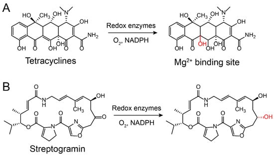 Inactivation of (A) tetracycline and (B) streptogramin by redox enzymes [95,96,97].