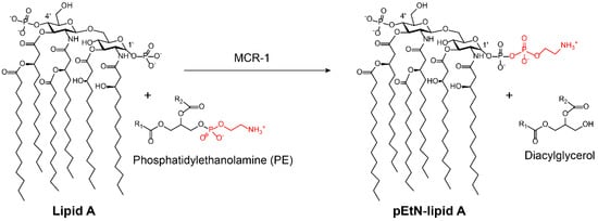 Scheme of bacterial lipid A modified by phosphatidylethanolamine (PE) through MCR-1 [121]. The modified groups on the antibiotic are in red; pEtN: phosphoethanolamine.