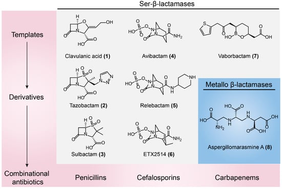 Clavulanic acid (Figure 9-(1)), a β-lactam-containing natural product, was the first identified β-lactamases inhibitor in the 1970s, isolated from a β-lactam antibiotic-producing strain of Streptomyces clavuligerus [41,122]. Clavulanic acid has poor antibiotic activity but it does show potent and irreversible inactivation of Ser-β-lactamases [123]. This unprecedented discovery gave rise to the first antibiotic/adjuvant combination that could be successfully approved in clinical use. For example, Augmentin (amoxicillin/clavulanic acid) has been applied in the clinic for over 30 years [124]. The wide use of clavulanic acid facilitated the development of other β-lactamase inhibitors, including the β-lactam sulfones tazobactam (Figure 9-(2)) and sulbactam (Figure 9-(3)) that are paired with piperacillin and ampicillin, respectively [125,126]. However, these β-lactam sulfones inhibitors are predominantly restricted to type A Ser-β-lactamases. The increase in type C and type D β-lactamases such as plasmid-borne AmpC [127] and oxacillinases [128] have progressively eroded the efficacy of these three inhibitors. To counter this threat, a new class of non-β-lactam β-lactamase inhibitor, diazabicyclooctanes (DABCOs), was introduced into clinical practice [129]. For example, avibactam (Figure 9-(4)) maintains the capacity to covalently acylate its β-lactamase targets [130], including CTX-M [131,132,133], AmpCs, and K. pneumoniae carbapenemase (KPC) [134,135]. Avycaz (a combination of ceftazidime and acibactam) was approved for clinical use by the FDA in 2015 [136]. Besides, DABCO relebactam (Figure 9-(5)) paired with imipenem or cilastatin are also being investigated [137,138]. Notably, neither avibactam nor relebactam are effective against A. baumannii infections, owing to a wide variety of class D β-lactamases expressed by this micoorganism [139]. By modifying DABCO scaffold to extend its spectrum of activity to a broad range of class D enzymes, ETX2514 (Figure 9-(6)) was optimized as the best candidate with high inhibition activity towards clinically relevant class A, C, and D β-lactamases and penicillin-binding proteins (PBPs). Importantly, the combination of sulbactam and ETX2514 shows high efficacy in MDR A. baumannii mouse infection models [140]. In addition, a novel structural β-lactamases inhibitor, Vaborbactam (Figure 9-(7)) based on a cyclic boronic acid pharmacophore was discovered, which is used paired with meropenem against Gram-negative bacteria, particularly for KPC-producing carbapenem-resistant Enterobacteriaceae (CRE) [141] (Figure 9).