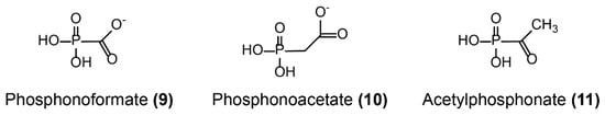 - Rigsby, R.E.; Rife, C.L.; Fillgrove, K.L.; Newcomer, M.E.; Armstrong, R.N. Phosphonoformate: A minimal transition state analogue inhibitor of the fosfomycin resistance protein, FosA. Biochemistry 2004, 43, 13666–13673. [Google Scholar] [CrossRef]