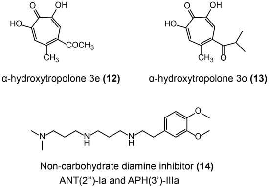 Aminoglycoside antibiotics are the foremost bactericidal drugs that specifically target the ribosome [151], which show potent antibacterial activity against both Gram-negative and Gram-positive pathogens. For instance, gentamicin, tobramycin, and amikacin are still widely used in clinical settings [152]. The prevalent resistance mechanisms of aminoglycoside antibiotics have been briefly described in Section 2.2, especially the aminoglycoside-modifying enzymes (AMEs) including nucleotidyltransferases (ANTs), phosphotransferases (APHs), and acetyltransferases (AACs). Some AMEs inhibitors have been reported to inhibit ANTs or multiple enzymes and restore antibiotics’ activity against resistant bacteria (Figure 11). The oxidopyrylium cycloaddition/ring-opening strategy was applied to determine the inhibition activity of a library of synthetic a-hydroxytropolones against ANT(2″)-Ia. As a consequence, two of these synthetic compounds, including α-hydroxytropolones 3e and 3o (Figure 11-(12/13)), restored gentamicin activity against ANT-(2″)-Ia-expressing bacteria [153]. Besides, some compounds showed evidence that they simultaneously inhibit multiple AMEs. A library of 45 non-carbohydrate AME inhibitors (Figure 11-(14)) was designed based on the 1,3-diamine pharmacophore found in aminoglycoside structures and were shown to be competitive inhibitors of ANT(2″)-Ia and APH(3′)-IIIa [154]. A detailed structure–activity relationship study of non-carbohydrate inhibitors revealed that the 3-(dimethylamino) propylamine moiety was critical for their inhibitory activity [155].