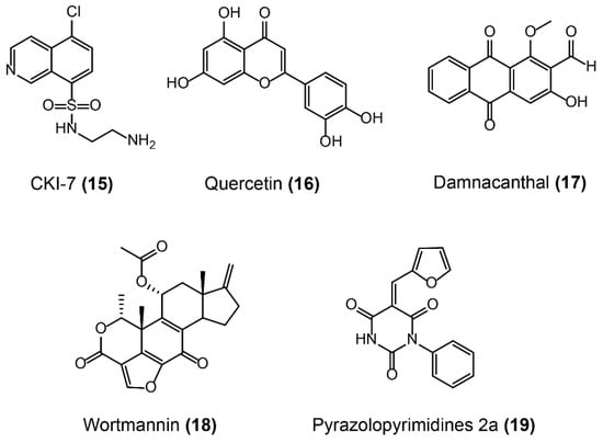 Similarly, several potent inhibitors of APHs were identified (Figure 12). Because of the high similarity of APHs to eukaryotic protein kinases in both protein structure and mechanism, protein kinase inhibitors were investigated as potential inhibitors of APHs, including CKI-7 [156], the aforementioned natural product kinase inhibitor quercetin [157], and damnacanthal (Figure 12-(15/16/17)) [158]. Besides, the lipid PI-3 kinase inhibitor wortmannin (Figure 12-(18)) also displays inhibitory activity towards APH(2´´)-Ia [159], owing to the analogous protein conformation between lipid kinases and APHs. However, these inhibitors may nonspecifically bind to eukaryotic protein kinases or lipid kinases in vivo, resulting in undesirable side effects. Therefore, compounds with a highly selective binding mechanism to AMEs would have a beneficial outcome, particularly for their safety in vivo. Meaningfully, pyrazolopyrimidines such as 2a (Figure 12-(19)) binds to and inhibits APH(3´)-I (a dominant resistance mechanism in Gram-negative pathogens) by a pathway that is distinct from the binding mode of human kinases [160], offering a potential route for derivatives that selectively inhibit APHs over human targets.