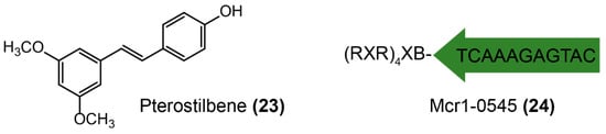 Two successful strategies were applied for screening MCR-1 inhibitors, including directly looking for molecules interacting with MCR-1 protein and targeting its mRNA (Figure 14). Pterostilene (Figure 14-(23), trans-3,5-dimethoxy-4′-hydroxystilbene), isolated from fresh leaves or fruit, has been previously reported owing to its potent anticancer [176,177], anti-inflammatory [178], and antioxidant activities [179]. Recently, pterostilene was found to be a novel MCR-1 inhibitor [180], which rescues the efficacy of polymyxin B both in vitro and in vivo. A significant synergistic effect between pterostilbene and polymyxin B (fractional inhibitory concentration index 0.156 or 0.188) against MCR-producing E. coli of both human and animal origins was observed. However, more mechanistic studies are required to elucidate the potentiation activity of pterostilene. Transcription inhibition of enzyme-coding genes also provides a potential approach to rescue antibiotic activity, such as specifically designed antisense oligonucleotides [181,182,183], which suppress bacterial genes expression on the basis of complementary interaction. The obstacle that mostly limits the adjuvant potential of antisense oligonucleotides is the highly impermeable bacterial membrane [184]. Besides, bacteria do not initiatively uptake oligonucleotides from their environment [185]. Therefore, conjugation with vectors such as lipids [186], cell-penetrating peptides [187], polymers [188], and nanoparticles [189] would facilitate the delivery of antisense oligonucleotides to various bacterial cells. For example, an optimized cationic peptide-conjugated phosphorodiamidate morpholino oligomer (PPMO) Mcr1-0545 (Figure 14-(24)) was designed to target mcr-1 mRNA, preventing translation and modulating colistin resistance [190]. Excitingly, the combination of Mcr1-0545 with colistin offered a significant survival advantage in the murine sepsis infection model. Meaningfully, such antisense RNA strategies could be expanded to other applications for combating antibiotic bacteria by targeting different function genes [191,192,193], including bacterial essential gene (thus killing bacteria, like antibiotics) [194,195,196,197], resistance genes (thus rescuing antibiotic activity, like adjuvants) [190,198], and virulence genes (thus preventing bacterial pathogenesis, like anti-virulence agents) [199,200,201,202].