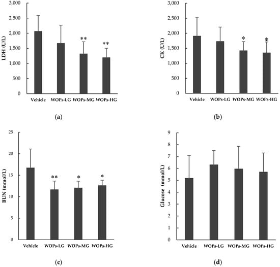 Several blood biochemical indicators were used to evaluate the degree of muscle fatigue and to explore the underlying mechanism, such as lactate dehydrogenase (LDH), blood urea nitrogen (BUN), creatine kinase (CK) and blood glucose [3,20]. In the present study, we examined whether WOPs could cause positive effects on these related biochemical parameters in the serum sample of mice (Figure 2). After 30 days of treatment, compared with the vehicle group, the activities of LDH, CK were significantly decreased in WOPs-MG and WOPs-HG (p < 0.01 for LDH activity, p < 0.05 for CK activity) (Figure 2a,b), and the BUN levels were markedly decreased in all three WOPs groups (p < 0.01 for WOPs-LG, p < 0.05 for WOPs-MG and WOPs-HG) (Figure 2c). There were no significant difference in the contents of blood glucose between the vehicle group and all WOPs group (p > 0.05) (Figure 2d).