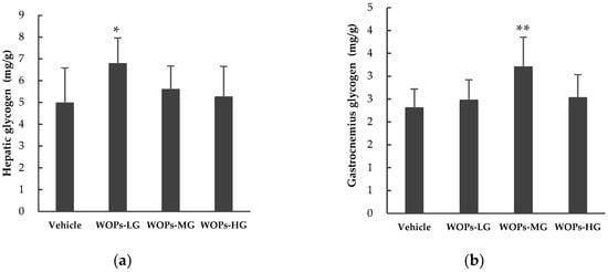 The glycogen storage is of great importance in enhancing exercise capacity and duration, and directly reflecting the level of fatigue [22,25,26]. After the mice administrated with WOPs for 30 days, the glycogen content of the liver and gastrocnemius were examined. As shown in Figure 3, the contents of hepatic glycogen in WOPs-MG and WOPs-HG (Figure 3a), and gastrocnemius glycogen levels in WOPs-LG and WOPs-HG (Figure 3b) showed minimal increased (p > 0.05). Moreover, there were a significant difference between the hepatic glycogen contents in WOPs-LG and the vehicle group (p < 0.05), and the gastrocnemius glycogen levels were markedly increased in WOPs-MG (p < 0.01).