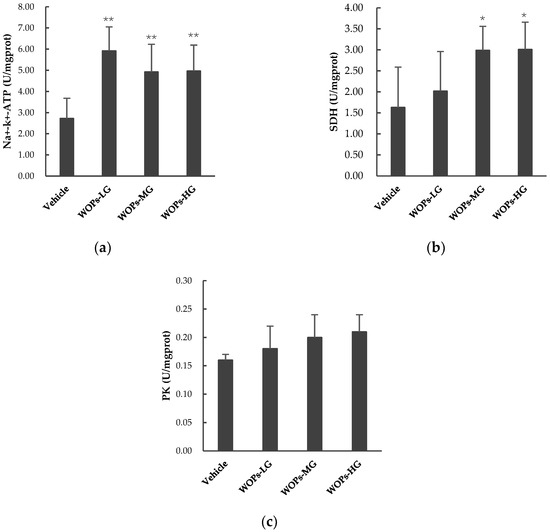 The regulation effects of WOPs on the activity PK, SDH, and Na+-K+-ATPase in the skeletal muscle of mice. (a) Na+-K+-ATPase; (b) pyruvate kinase (PK); (c) succinate dehydrogenase (SDH). Values are expressed as mean ± SD (n = 10). * p < 0.05, ** p < 0.01 mean significant difference versus vehicle group. WOPs-LG, walnut oligopeptides low-dose group at a dose of 110 mg/kg; WOPs-MG, walnut oligopeptides medium-dose group at a dose of 220 mg/kg; WOPs-HG, walnut oligopeptides high-dose group at a dose of 440 mg/kg.