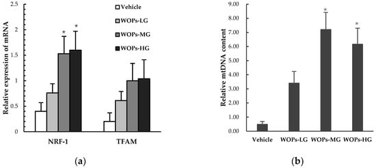 Both the nuclear respiratory factor 1(NRF-1) and mitochondrial transcription factor A(TFAM) were mitochondrial biogenesis factors considered essential for mitochondrial gene expression in mammals, the result showed that the mRNA expression of NRF-1was markedly increased in WOPs-MG and WOPs-HG groups compared with the vehicle group (p < 0.05) (Figure 5a). In addition, the mitochondrial DNA (mtDNA) copy number was also significantly improved in WOPs-MG and WOPs-HG groups after the WOPs treatment (p < 0.05) (Figure 5b).