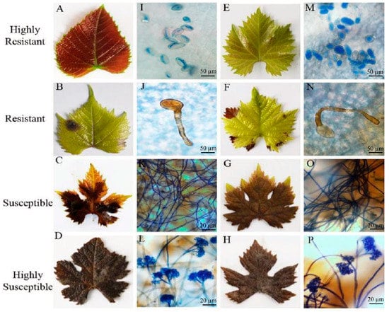 Macroscopic (A–D and E–H) and microscopic (I–L and M–P) evaluation of two representative Vitis genotypes, collectively representing the different Botrytis cinerea resistance levels. Highly resistant genotypes ’Zi Qiu’ and ‘Ju Mei Gui’ are shown in (A,I) and (E,M), respectively. Resistant genotypes ‘Kang San’ and ‘Rizamat’ are shown in (B,J) and (F,N), respectively. ‘Flame’ and ‘Canner’ represent susceptible genotypes and are shown in (C,K) and (G,O), respectively. ‘Riesling’ and ‘Pinot noir’ are highly susceptible and are shown in (D,L) and (H,P), respectively. Scale bars (I,J,M,N): 50 µm; (K,L,O,P): 20 µm. Samples were collected 96 h after inoculation and then one representative leaf of three biological replicates were analyzed.