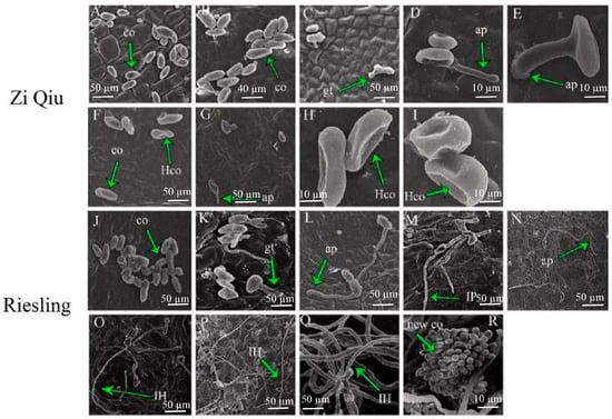 Comparison of Botrytis cinerea conidia development on ’Zi Qiu’ and ‘Riesling’ leaves using scanning electron microscopy. Progression of B. cinerea colonization on ’Zi Qiu’ (A–I) and ‘Riesling’ (J–R). Leaves were harvested at 4, 8, 12, 18, 24, 36, 48, 72, and 96 hpi, and the experiments were repeated three times. Arrows indicate co, conidia; gt, germ tube; ap, appressoria; IP, infection peg; IH, infection hypha; new co, new conidia; and Hco, hollow conidia.