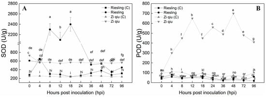 Superoxide dismutase (SOD) (A) and peroxidase (POD) (B) activities of protein extracts from ’Zi Qiu’ and ‘Riesling’ leaves at 0, 4, 8, 12, 18, 24, 36, 48, 72, and 96 h post-inoculation (hpi) with Botrytis cinerea, using sterile water as the control. Three independent experiments were used for the means and standard errors. Small alphabetes indicate significant differences according to LSD test (p < 0.05) between “Zi qiu” and “Riesling”.