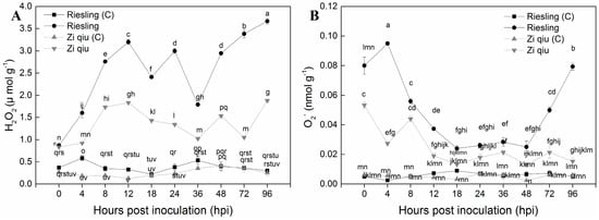 The ‘Zi Qiu’ and ‘Riesling’ O2− production rates were calculated at different time points (0, 4, 8, 12, 18, 24, 36, 48, 72, and 96 hpi) as previously described [49]
