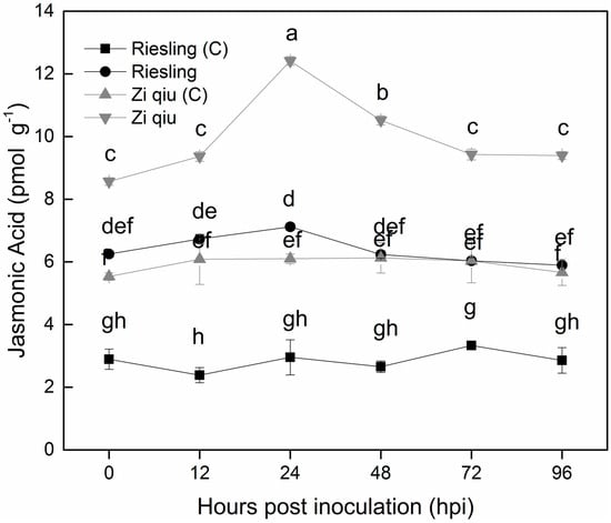 JA levels were determined in both ‘Zi Qiu’ (V. davidii) and ‘Riesling’ (V. davidii) samples isolated from inoculated and control treatments at various time points. JA levels were higher in ‘Zi Qiu’ (Figure 6) than in ‘Riesling’ (Figure 6) at all time points. JA levels in the ‘Zi Qiu’ control were the same as for ‘Riesling’ inoculated from 0 to 96 hpi.