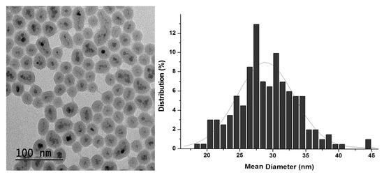 Transmission electron microscopy (TEM) images (left) and the corresponding particle size distribution histograms of MNP@SiO2 expressed as distribution as function of mean diameter (right).