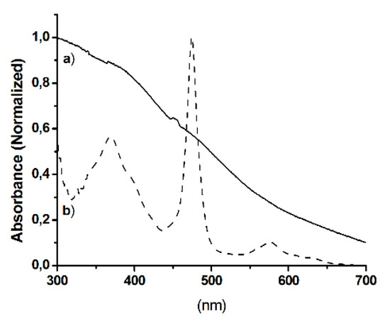 UV-Vis spectra of: (a) MNP@SiO2-NH-TDFPP-Mn(III), (6) in DMF; (b) non-immobilized metaloporphyrin (5), in CHCl3, expressed as normalized absorption as function of wavelength.