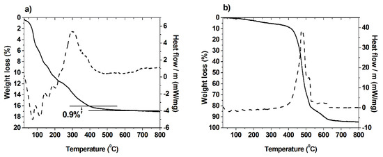 Thermogravimetry/differential scanning calorimetry (TG-DSC) curves (weight loss–solid line; heat flow–dashed line) of: (a) MNP@SiO2-NH-TDFPP-Mn(III) (6); (b) β-nitro-metalloporphyrin (5). (a,b) are expressed as weight loss as function of temperature.