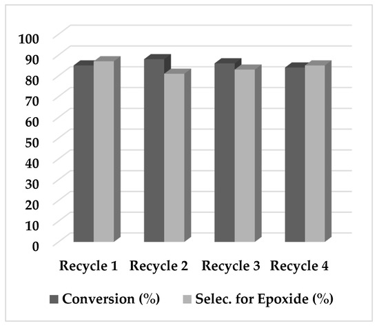 The hybrid manganese(III)-porphyrin magnetic nanocomposite (6) exhibited an excellent recycling capacity. After four consecutive runs, no loss of activity or selectivity for (−)-isopulegol benzyl ether epoxides A and B (Figure 7) was observed. Furthermore, other than the high activity and selectivity, it is worth noting the great stability of the manganese(III) porphyrin magnetic material, MNP@SiO2-NH-TDFPP-Mn(III) (6), as no catalyst leaching was detected upon four cycles, which was herein demonstrated using UV-Vis analysis of the reaction’s crude. These stabilizing effects of the metalloporphyrins onto magnetic nanomaterial support may be attributed to the formation of catalytically inactive oxo-dimeric metalloporphyrin species [57].