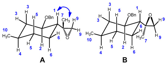 Structures of diastereomers A and B of (−)-isopulegol benzyl ether epoxide and the NOE cross-peaks. NOESY spectra of diastereoisomer A shows an interaction between H1-H7(CH3), indicating a proximity between these protons. For the diastereoisomer B, the NOE H1-H7 (CH3) was not observed.