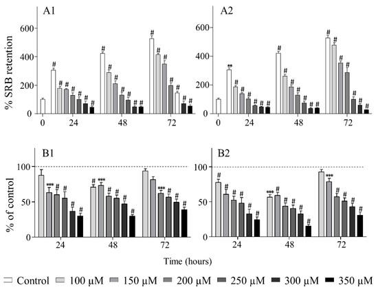 Dose and time-dependent response plots of the effect of epoxide A (A1,B1) and epoxide B (A2,B2) on cell viability, for the MG-63 cell line for dosages between 100 and 350 µM. Results obtained by the sulforhodamine B (SRB) (A1,A2) and 3-[4,5-dimethylthiazol-2-yl]-2,5 diphenyl tetrazolium bromide (MTT) (B1,B2) assays, are represented as a percentage of the control (cells treated with the dimethyl sulfoxide (DMSO) vehicle). The data are standard error of the mean ± SEM of the values obtained for 3 independent experiments (n = 3), carried out in triplicate. ** p < 0.01, *** p < 0.001, # p < 0.0001 versus control cultures.
