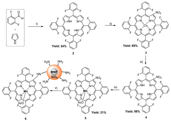General synthesis of hybrid manganese(III)-porphyrin magnetic nanocomposite(6): (i) Acetic Acid/Nitrobenzene (3:1); NaY; 150 °C; (ii) Cu(NO2.3H2O; Acetic Anhydride/Acetic Acid (5:1); 60 °C; (iii) H2SO4; 25 °C; (iv) Mn(OAc)2; DMF; 150 °C; (v) CsCO3; MNP@SiO2-NH2 nanoparticles; 85 °C).