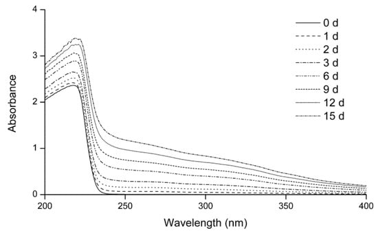 In the intermediate stage of the Maillard reaction, some products that show ultraviolet absorption are generated [21]. Figure 1 shows the ultraviolet spectra of the fructose–histidine Maillard reaction model system during heating at 80 °C and pH 6.0 for up to 15 days. Before heating, the maximum absorption peak appeared at 217 nm, with no absorbance detected in the wavelength range of 240–400 nm. With prolonged heating, the absorbance at 217 nm increased, while an absorbance at 240–400 nm was detected and increased over time. This enhanced ultraviolet absorption was attributed to the formation of new compounds in the Maillard reaction of fructose and histidine.