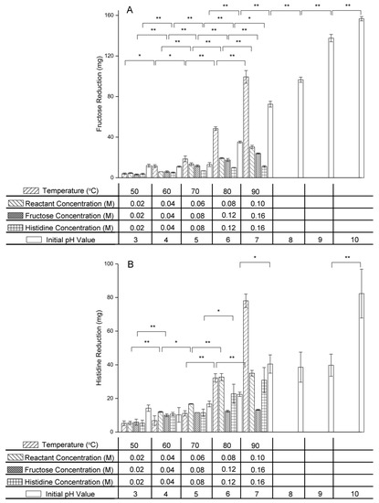 (A) Fructose and (B) histidine reduction in the fructose–histidine Maillard reaction model system (* p < 0.05; ** p < 0.01).