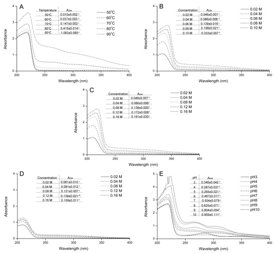 2.3. Effect of Variables on Ultraviolet Spectra and Absorbance at 294 nm